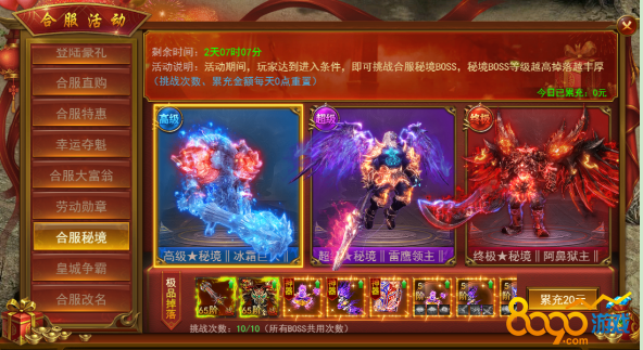 活动期间,满足进入条件即可挑战合服秘境boss,秘境boss等级越高掉落越丰厚,挑战次数每日重置。