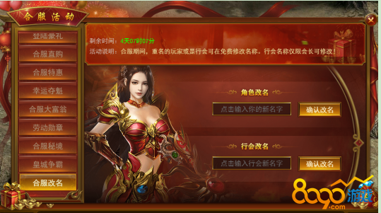 合服期间,从服的重名玩家或行会可在此免费修改名称,行会名仅限会长修改。