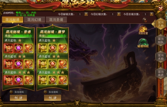 (1)副本有三个类型,每个类型有2个难度,分别达到不同的开服天数开启;达到开启天数后,满足战力、混沌值等条件