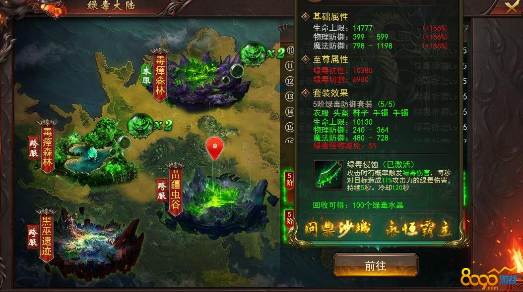 搜索"8090网页游戏"在8090维京传奇页游中,开服7天后的区服将会开启绿毒大陆的玩法,并且开启一套全新的装备,绿毒装备,在这个大陆中,玩家必须拥有绿毒切割以及绿毒抗性才能生存下去,那么该怎么获得绿毒装备呢?