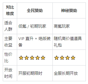 💡 建议:零氪或低氪玩家优先选全民赞助,VIP 等级和绝版装备的综合收益超过神秘赞助;重氪玩家可两个都参与。