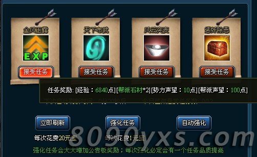 好了,说到这里大家应该都明白了,其实我们没有必要每次都把4个任务全部领取,各位大侠可以每次刷新后只领取和完成经验任务,这样就可以获得获得多多的经验了。比如上图,如果全部做经验任务,一共可以获得8.2万8090武林3经验哦!~