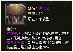 在武林3侠客中,洪七公是作为一个单攻型的侠客,具有强大的单体爆发杀伤能力。