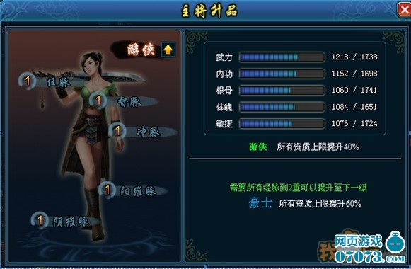 1.五条经脉达到特定重数,品质提升:0重为武者,1重为游侠,2重为豪士,3重为奇人。