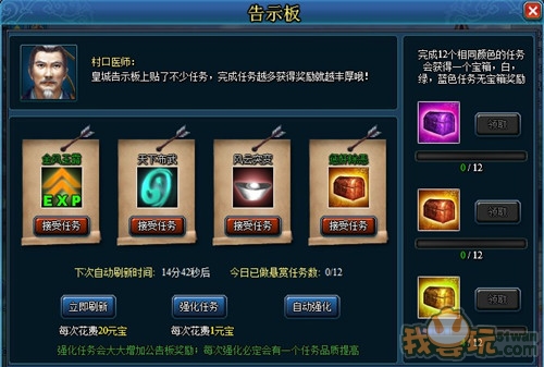 5.公告板:在襄阳城有一个公告板,玩家每天可以在上面接到12个不同类型,不同等级的任务。在完成这些任务之后,可以获得经验,银两,修为,帮派声望,以及帮派声望道具。在玩家累积完成12个同等级的任务之后(紫色等级任务以上,包括紫色等级任务),还能领取同等级宝箱一个。