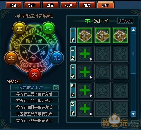 8090武林3中五行系统共有五种天赋,土=体魄,木=敏捷,火=武力,水=内功,金=根骨,五行对人物的属性加成有两种方式,一种是通过服用丹药对天赋进行加成,称为基础五行。基础五行的第一层每次服用丹药可+20对应属性,每层可以加3次。当人物金木水火土对应的一层全部吃满后就可以开启特有的加成系统。