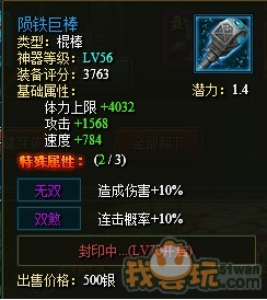 神器选择方面,紫色神器推荐选择第一无疑是罗汉棍(攻血速),其次是玄铁剑(攻防血)。用罗汉棍的好处不用多说,保证先手;而玄铁剑,则是能增加一些站桩能力(带了玄铁剑,一般很少能直接被秒,但是有被封的危险,应对方法后面会详细分析);蓝色神器选择陨铁巨棒,同样是攻血速的加成。神器效果洗练方面,着重无双(10%伤害),双煞(10%概率连击);此时可以有不同的打造路线,即破击和暴击两种路线(个人不推荐两种同时发展),暴击方面可以选择残暴,雷厉,龙胆;破击系列选择破天,风驰,虎狩。(个人感觉素素用破击比较好,因为技能有随机性,破击保证打到前排防御型也能造成大量伤害。)