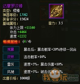 然后是套装选择方面,我建议2种选择方法,钱包不富裕的朋友可以选择第一种,敏捷型就是50的女娲套装,增加闪避速度命中的属性,放弃了少量攻击,增加了出手速度和存活能力,是最适合需要先手控制权的老黄(和成昆差不多)。第二种则是暴力打法的50级盘古套装(后面有对应级别相同属性的套装)增加部分攻击,让老黄出手不仅带来控制,也能带来不菲的伤害数据。