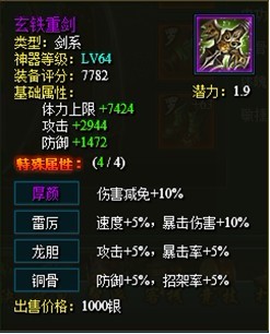 神器选择方面,紫色神器依旧推荐银光流水衣;玄铁重剑。蓝色的也是推荐衣服或者金蛇剑或者算盘。神器特效方面,不败、厚颜、忠胆、混元、金钟、铁壁。铜骨。
