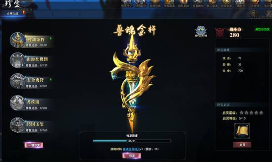 收集散落在江湖各地的珍宝碎片,通过消耗各类珍宝碎片对传世珍宝进行修复,修复珍宝达成一件以上即可激发珍宝连锁,可大量提升自身属性,增加战力。