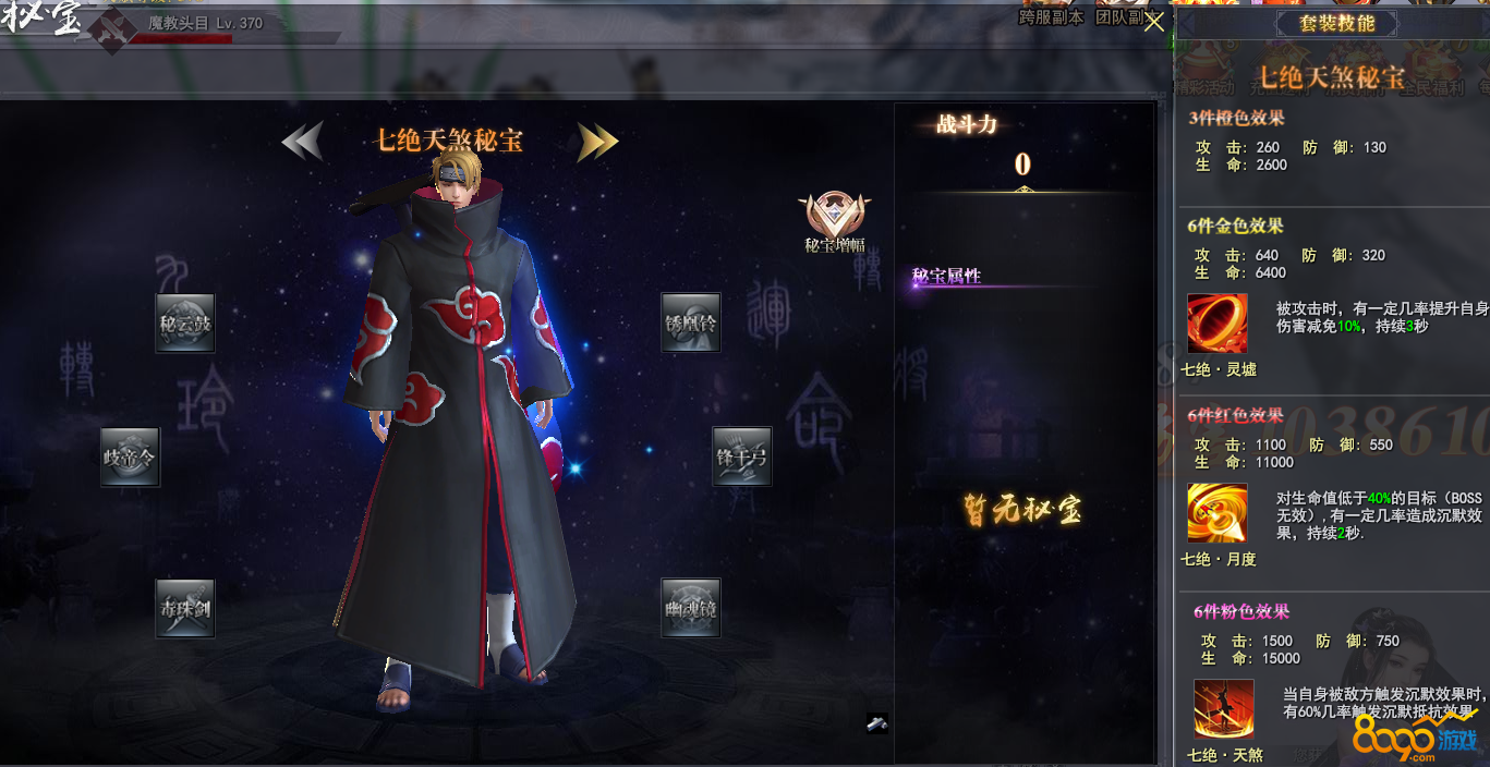 搜索"8090网页游戏"武林三游戏中秘宝系统共分三种七绝天煞秘宝、青虹破风秘宝、天玑神凤秘宝以及极上神梦秘宝。每种秘宝都需要6件装备来激活。七绝天煞秘宝需要秘云鼓、毒株剑、岐帝令、锈凰铃、锋干弓以及幽魂镜激活,秘宝强化需要秘宝精粹来强化在群雄逐鹿游戏活动或者秘宝分解都可以获得其道具。七绝天煞秘宝3件装备增加攻击260、防御130、生命值2600。6件装备金色效果增加攻击640、防御320以及生命值6400。并且带有额外特殊技能被攻击时,有一定几率提升自身的伤害减免10%,持续3秒。