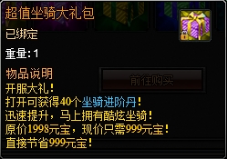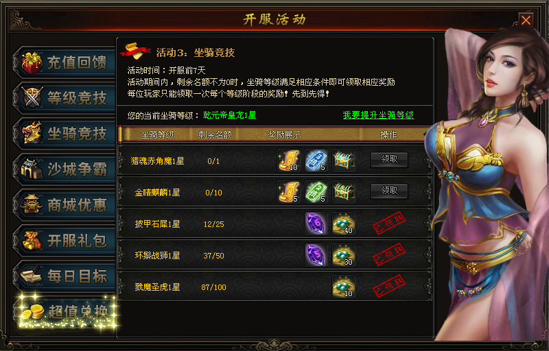 【活动内容】只要坐骑等级达到特定的等级,就可以领取系统赠送的豪华大礼