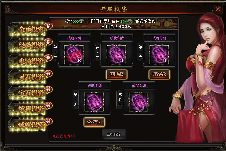 活动时间:开服前三天可进行投资,投资奖励后续5天领取完毕