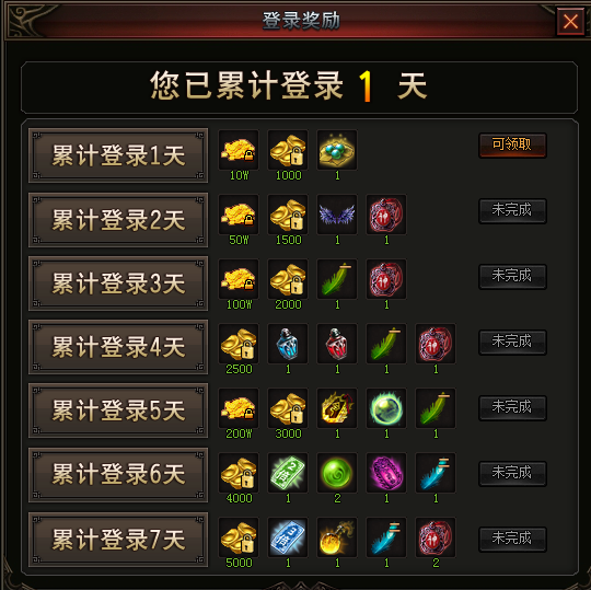 活动说明:累计登陆前七天即可领取对应登陆天数奖励,