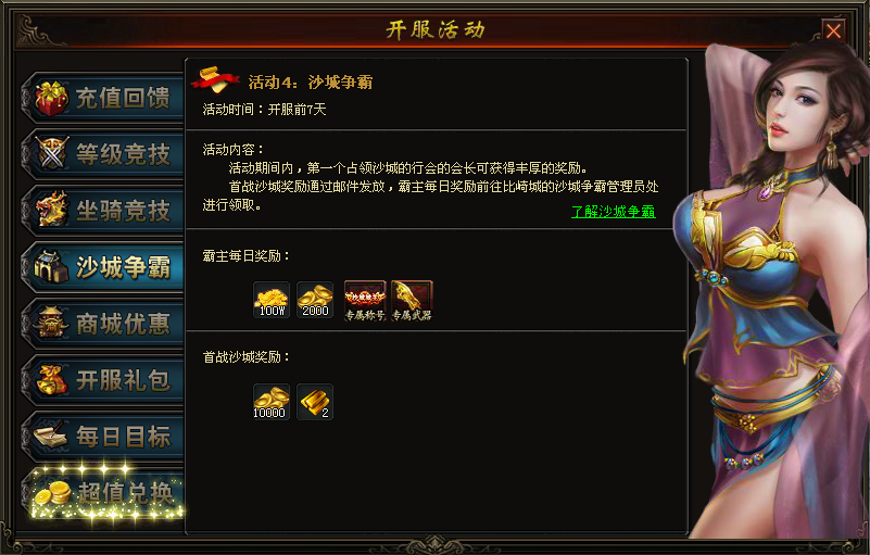 活动说明:新区开服后第一次城争霸赛获得胜利的王族会长都能获得额外的元宝奖励