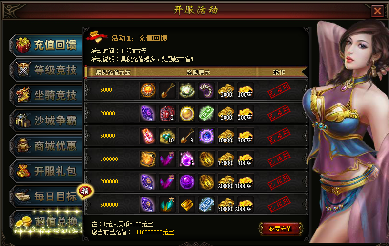 活动说明:累计充值达到一定数量即可获取至尊奖励