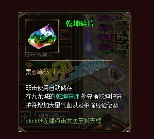乾坤碎片为乾坤护符存在,护符可加HP、MP、经验倍数,护符档次越高,加成的属性也就越多,而想要获得护符或者升级、兑换护符,那就要用到乾坤碎片,收集一定数量的乾坤碎片可兑换1档或者5档护符,通过不断合成可对护符进行升级兑换。