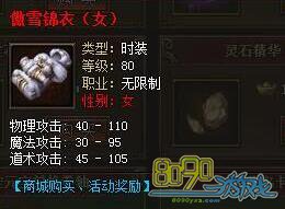 傲雪锦衣(女),任意职业都能穿戴,80级以上即可,可以增加物理攻击40-110,魔法攻击30-95,道术攻击45-105,来源为商城购买或活动奖励。
