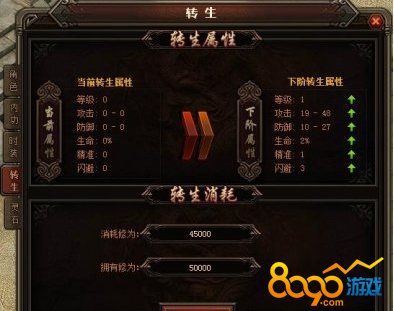 转生分为12个等级,等级越高可获得更多的各项属性加成,极大的提升角色的战斗力。