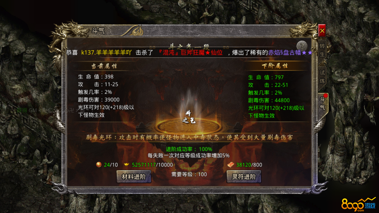 升级斗气等级提升生效等级,剧毒伤害,提升对于怪物的伤害。实际对怪生效等级等于斗气获得的生效等级加上玩家自身的等级。击杀大部分的怪物改了掉落一始丹,带有斗气后缀的怪物会有更高的概率。