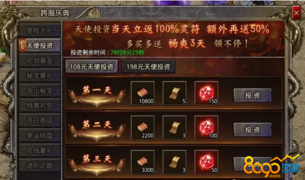 天使投资,分为108元天使投资和198元天使投资。当天立刻返还100%灵符,额外可以再送50%灵符,只要第一天购买就可以一直领取三天的奖励,相当划算,这个建议必买。
