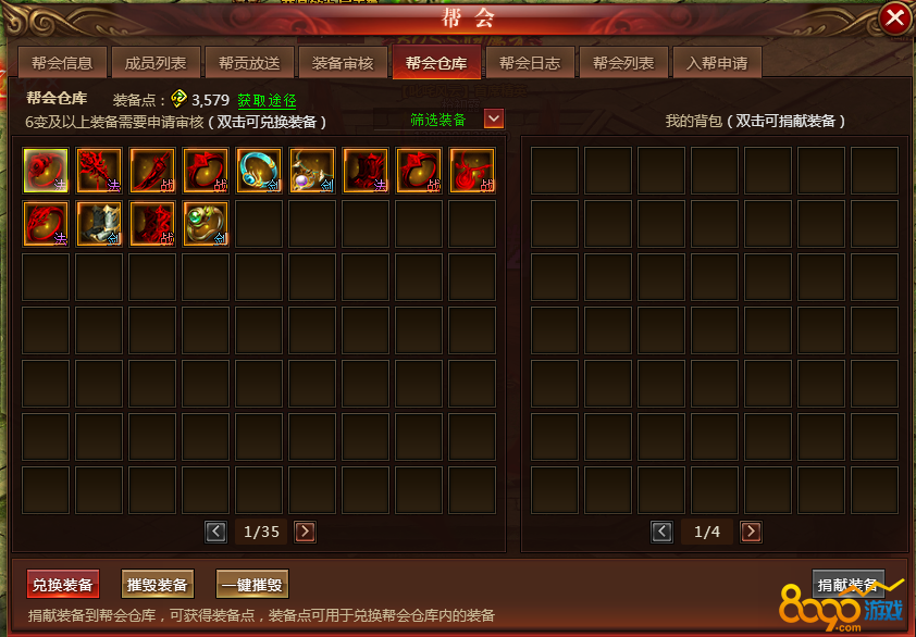 玩家在到达一定等级之后,可以加入帮会,因为游戏本身是有三个职业存在的,所以玩家经常会打到一些不错的但是不是自己职业不能穿的装备,不用着急分解掉,可以在加入帮会之后,通过捐献装备到帮会仓库里获得装备点,装备点可以兑换仓库里的装备,同样的,要是别人把不是他职业的确是你职业的装备放进了仓库,你就可以兑换出来了,这样就会大大提升玩家获得装备的效率了。