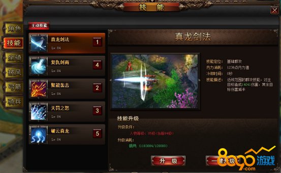 【真龙剑法】:近战群攻技能,可以对主目标造成大量伤害,对其余目标伤害减半。