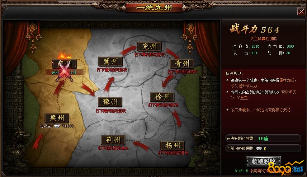 打开一统九州系统界面,选择目前所攻打的州,然后每个州还有各个郡县,只有所有的郡县都通关才算真正占领这个州。另外,没占领一个城池,主角可获得属性加成,永久提升战斗力,玩家可以向占领的城池领取税收,税收在每天的24点会重置。每攻下一个州的最后一个城池都会获得镇守武将。