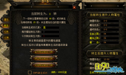 在武神诀中,角色等级达到指定等级(第一次转生为80级)时,便可进行武神诀转生,点击角色面板下转身按钮,可以打开武神诀转生面板: