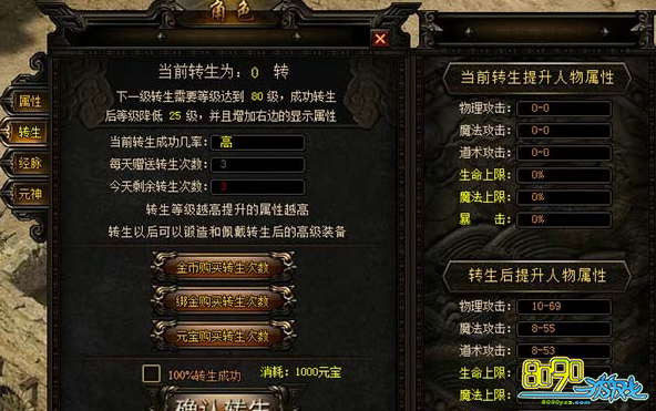 转生方法:点击角色面板下转身按钮,可以打开转生面板