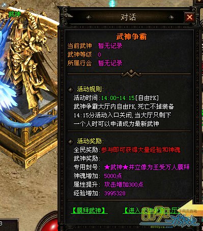 14:15之后玩家就不可以再进入武神大厅了,随之而来的就是血雨腥风,活到最后的玩家,就可在地图中间【争霸使者】处,领取武神称号和奖励,其他玩家,系统会自动发放奖励。