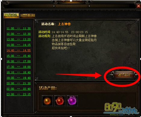 活动规则:上古战场开启时间会刷新上古神兽,击倒上古神兽可以掉落大量的坐骑经验丹,物品自由拾取。