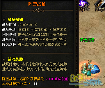 活动开始阶段,玩家可以通过NPC[阵营战场]进入神魔战场,活动中能获取阵营战场NPC的自动寻路左边,有VIP的小伙伴也能直接传送到阵营战的周围,当然了阵营战的报名时间只有10分钟。