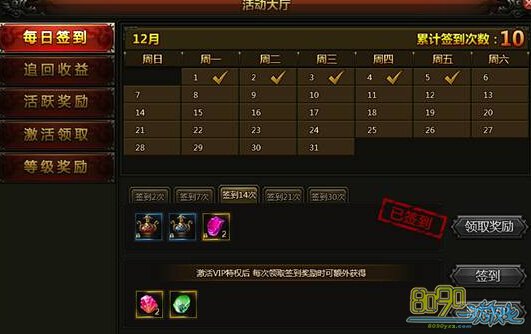 玩家们每天登陆都会有相对应的奖励哦,累积签到2次、7次、14次、21次、30次,都可以领取奖励,激活VIP后,每日签到还能额外获得赤焰晶石*2、虎魄晶石*1。