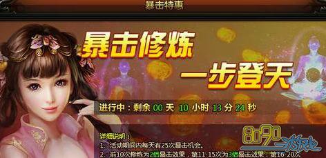 暴击特惠活动有25次的暴击机会,玩家们在暴击时的几率是不同的哦,前十次是暴击2倍,11-15次是3倍,以此类推。