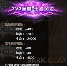 3v3至尊称号的获取条件就是要在3V3的排名赛中获得第一,佩戴这个称号可以获取攻击+400,防御+200,生命+24000,激活后就是攻击+80,防御+40,生命+4800了。