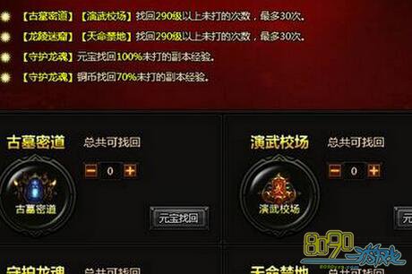 玩家前一天的副本要先打好才行,第二天才能申请追回,龙陵迷窟,天命禁地,墓密道,演武校场的追回等级是290级,上限是30次。