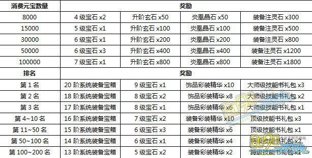 活动期间累计消费达到一定元宝可获得奖励,且玩家可根据个人消费排名获得对应奖励。