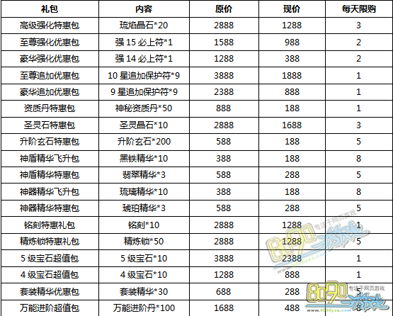 【活动内容】活动期间,玩家可以购买以下三个礼包,每个礼包每次限购一次。