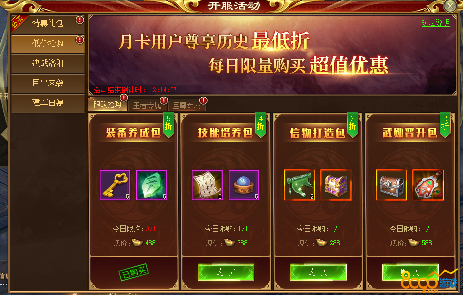 史上最划算元宝低折一键买齐全套晋升包;开通特权卡享更多购买次数