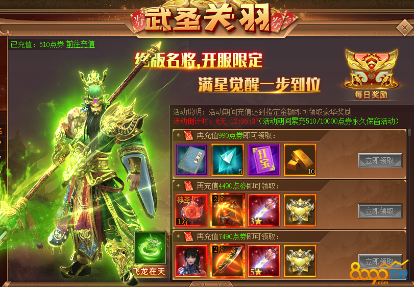 累计5天,每天充值满1000点券可额外领取武将甘宁全套觉醒装备