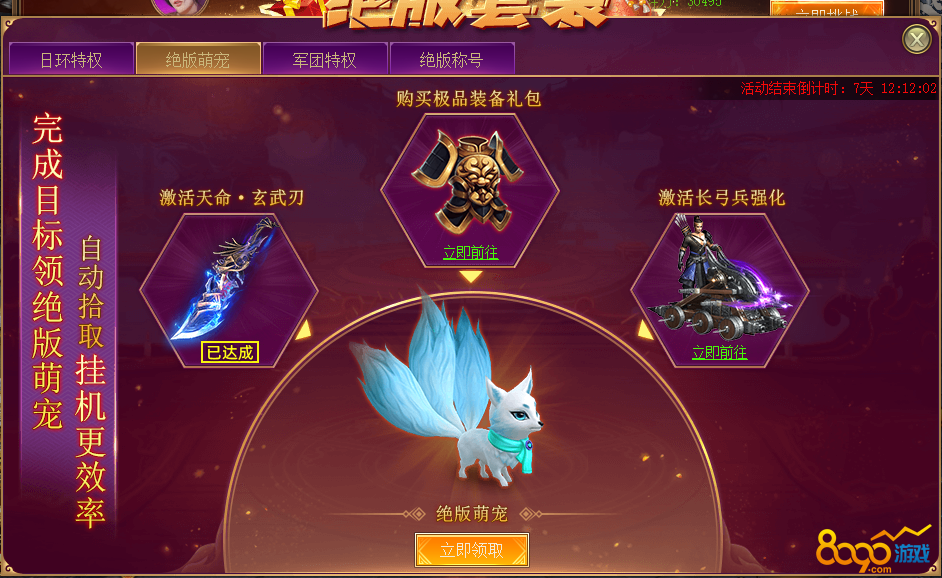 绝版萌宠:激活天命·玄武刃+购买极品装备礼包+激活长弓兵强化=激活萌宠青丘稚狐