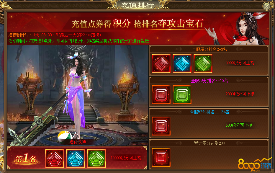 根据消费积分进行排名,活动最后一天22:00结榜,并将奖励通过邮件发放