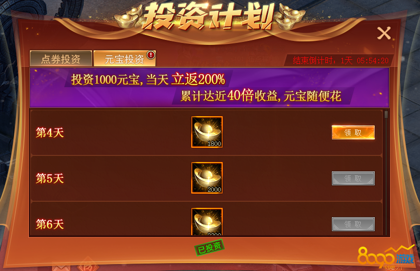 仅开服前7天可参与投资,参与投资后活动永久存在