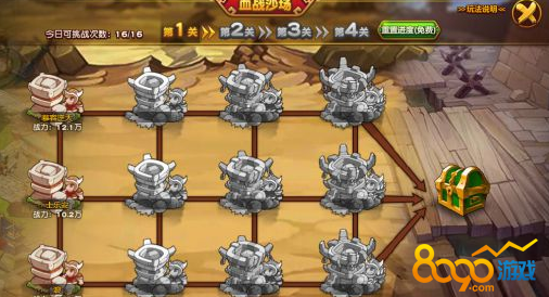血战沙场一共4层,每层都有大宝箱,想要拿到每层的宝箱要先击败守护宝箱的敌人。宝箱内有兽魂、神炼元素、兽灵丹等培养珍兽的必备物品。想要提高珍兽,先要政府百战沙场。