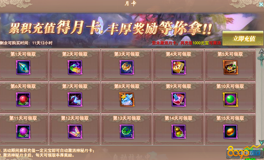 累计充值1000元宝激活神秘月卡后,每天可领取丰厚奖励,一共十五天。