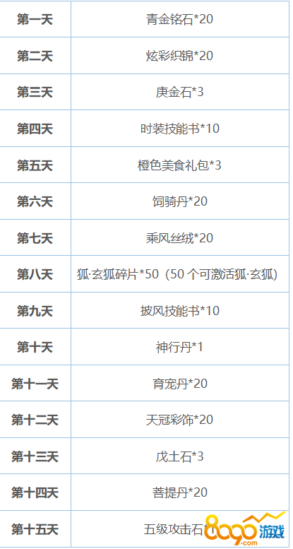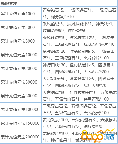 银两1万*4、真气500*1、真气2000*1、真气1000*2、绑定元宝100*2、青金铭石10*1、青金铭石1*2、气血包*1、内力包*1、2倍经验卡*1、2倍熟练度卡*1、还魂丹*1、行商令*1、玫瑰花*9、饲骑丹*9、3倍经验卡*1、育宠丹*10、三倍熟练度卡*1