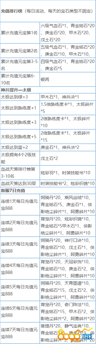 活动内容:新服累冲、天降红包、充值排行榜、神兵提升-太极、血战天策排行、新服7日充值、新服集字兑换