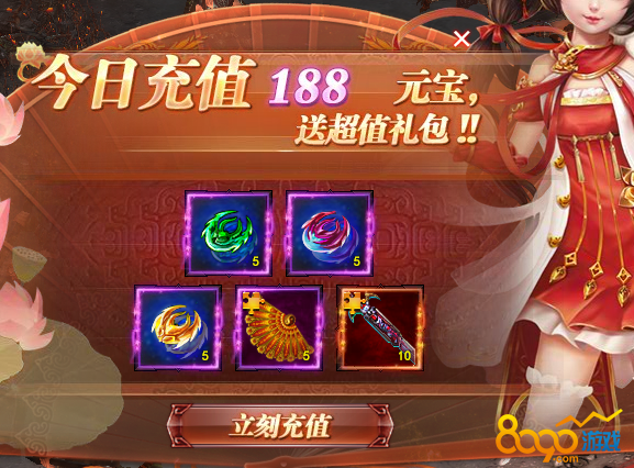 每日充值188元宝可以领取(戊土石*5、甲木石*5、庚金石*5、凤羽碎片*5、天凤霄灵碎片*10)