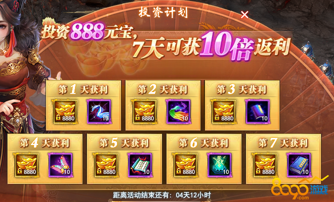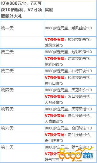 2.投资888元宝,登录七天可获10倍返利,V7还可领取专属大礼!